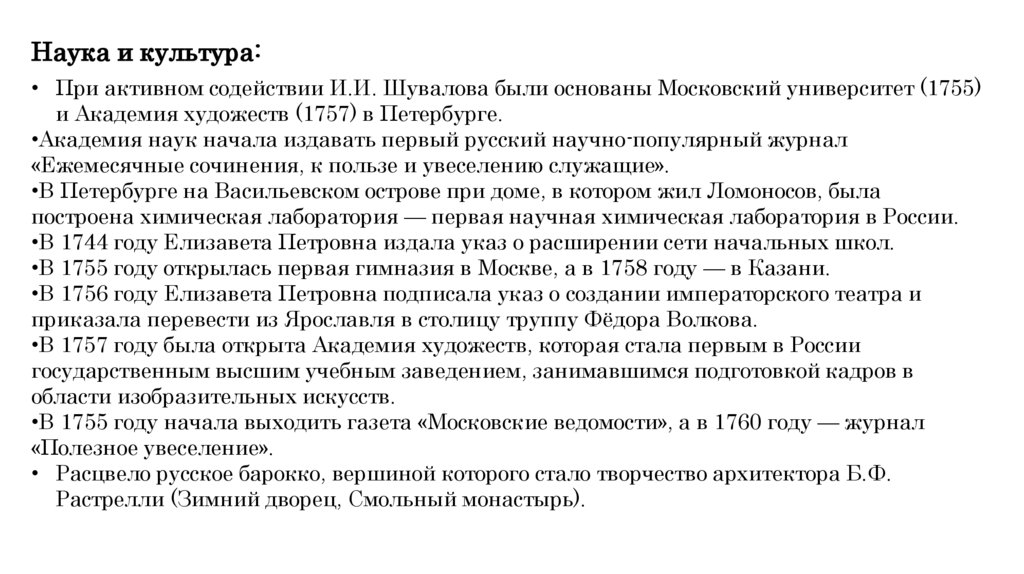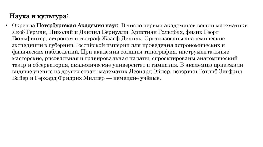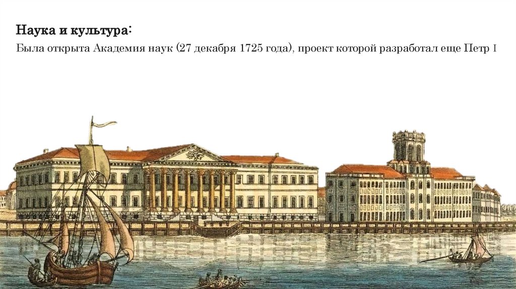 Наука и культура:Была открыта Академия наук (27 декабря 1725 года), проект которой разработал еще Петр I