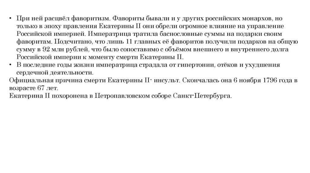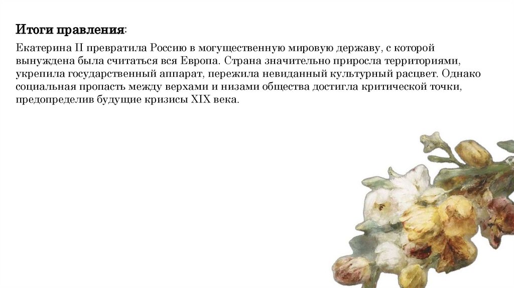 Итоги правления:Екатерина II превратила Россию в могущественную мировую державу, с которой