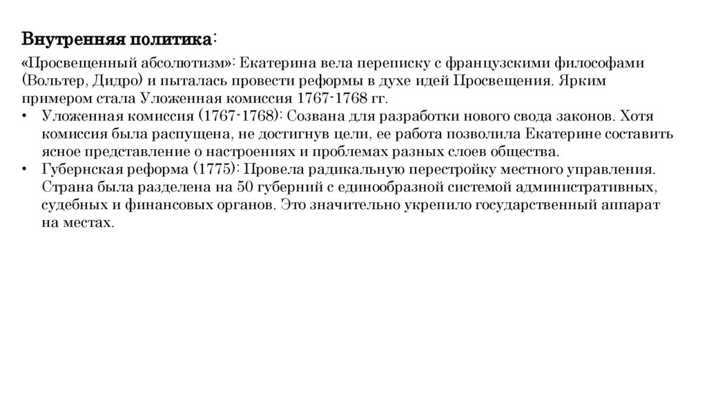 Внутренняя политика:«Просвещенный абсолютизм»: Екатерина вела переписку с французскими философами