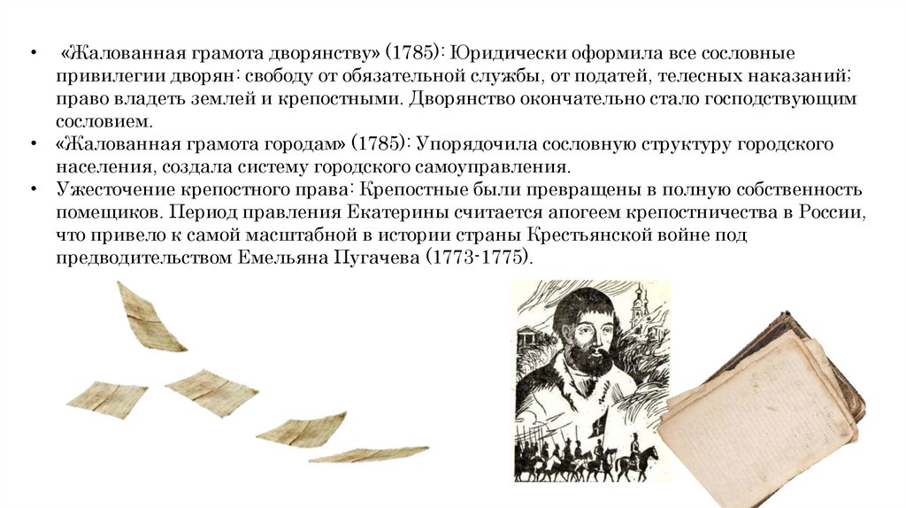 «Жалованная грамота дворянству» (1785): Юридически оформила все сословныепривилегии дворян: свободу от обязательной службы, от податей, телесных наказаний;