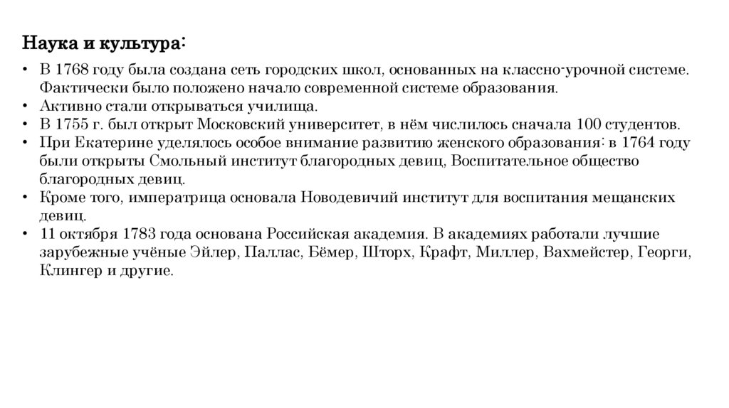 Наука и культура:• В 1768 году была создана сеть городских школ, основанных на классно-урочной системе.