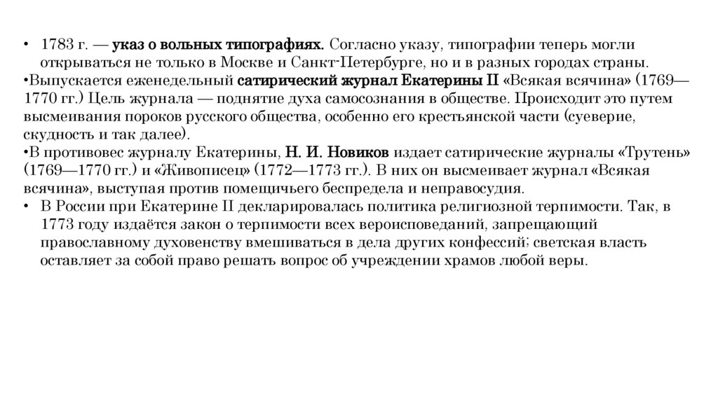 • 1783 г. — указ о вольных типографиях. Согласно указу, типографии теперь моглиоткрываться не только в Москве и Санкт-Петербурге, но и в разных городах страны.