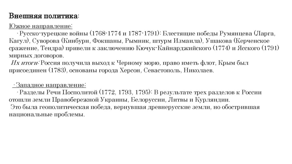 Их итоги: Россия получила выход к Черному морю, право иметь флот, Крым был