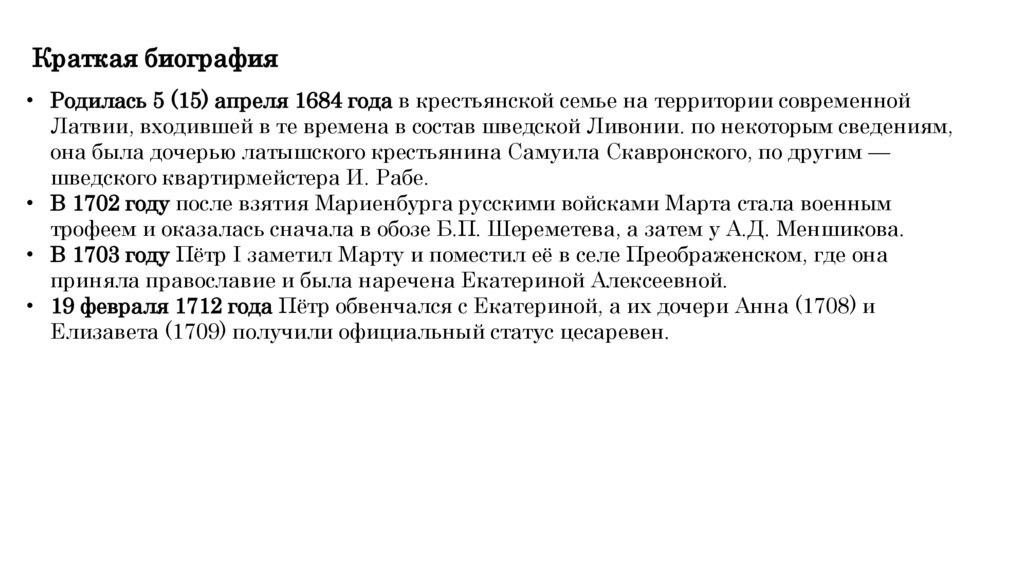 Краткая биография• Родилась 5 (15) апреля 1684 года в крестьянской семье на территории современной