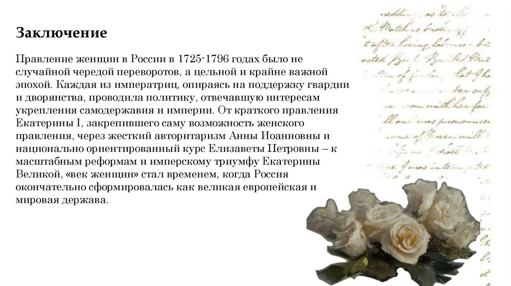 ЗаключениеПравление женщин в России в 1725-1796 годах было не