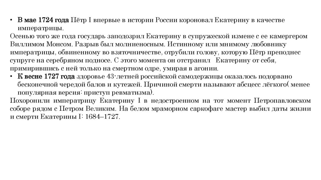 • В мае 1724 года Пётр I впервые в истории России короновал Екатерину в качествеимператрицы.