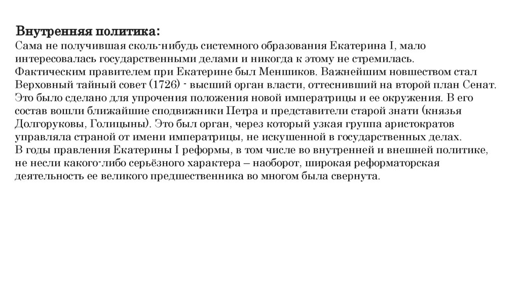В годы правления Екатерины I реформы, в том числе во внутренней и внешней политике,