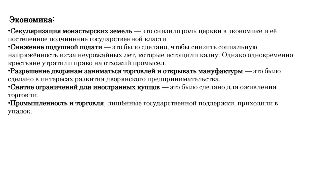 Экономика:•Секуляризация монастырских земель — это снизило роль церкви в экономике и её