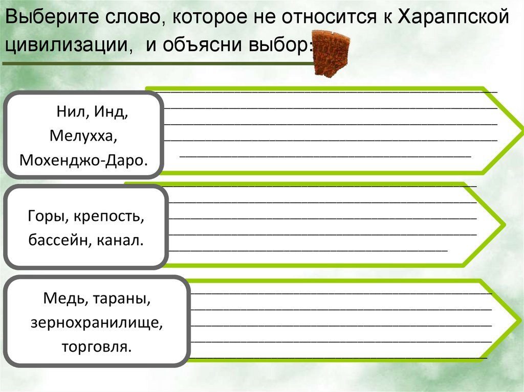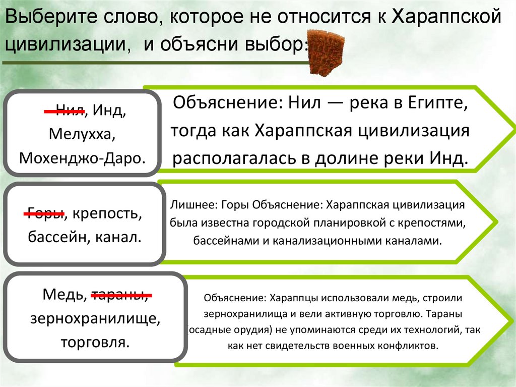 Выберите слово, которое не относится к Хараппскойцивилизации, и объясни выбор: