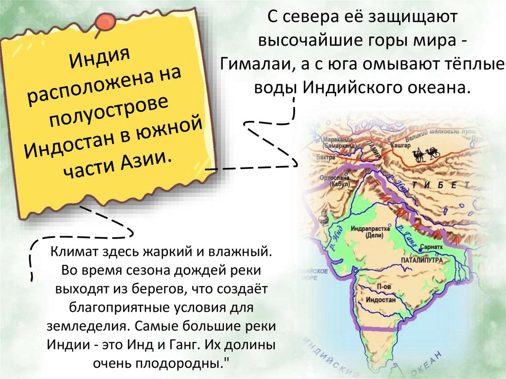 С севера её защищаютвысочайшие горы мира Гималаи, а с юга омывают тёплые