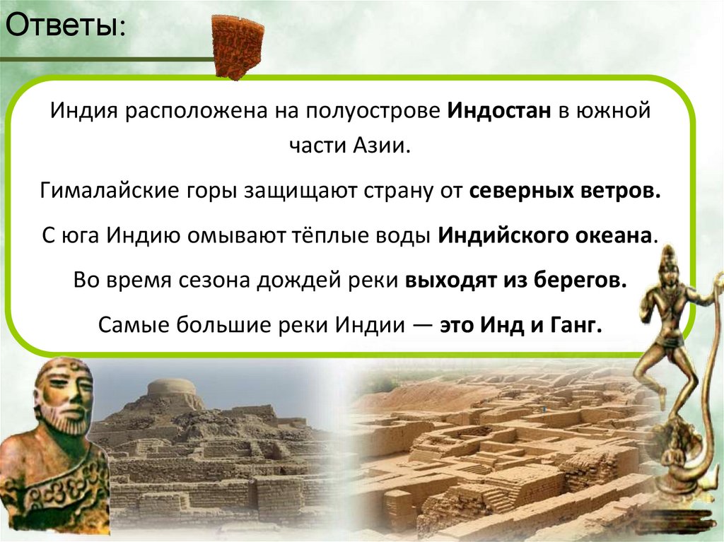 Ответы:Индия расположена на полуострове Индостан в южной