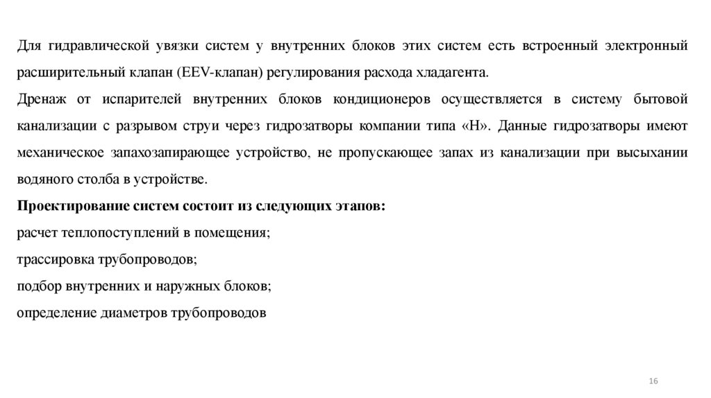 Для гидравлической увязки систем у внутренних блоков этих систем есть встроенный электронныйрасширительный клапан (EEV-клапан) регулирования расхода хладагента.
