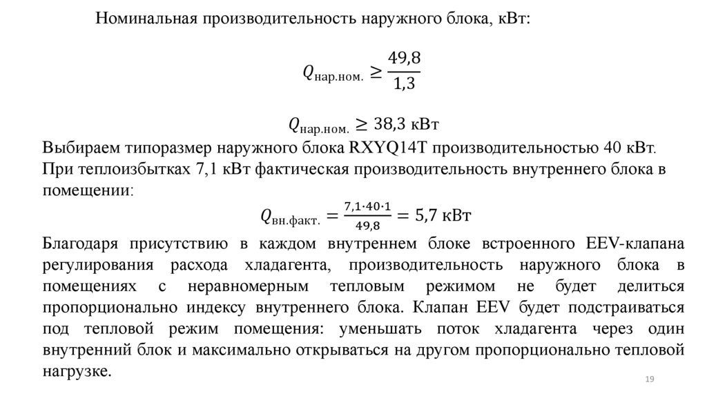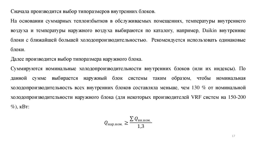 Сначала производится выбор типоразмеров внутренних блоков.На основании суммарных теплоизбытков в обслуживаемых помещениях, температуры внутреннего