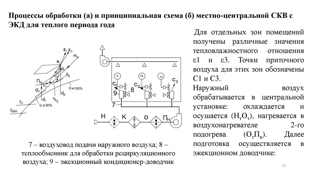 Процессы обработки (а) и принципиальная схема (б) местно-центральной СКВ сЭКД для теплого периода года