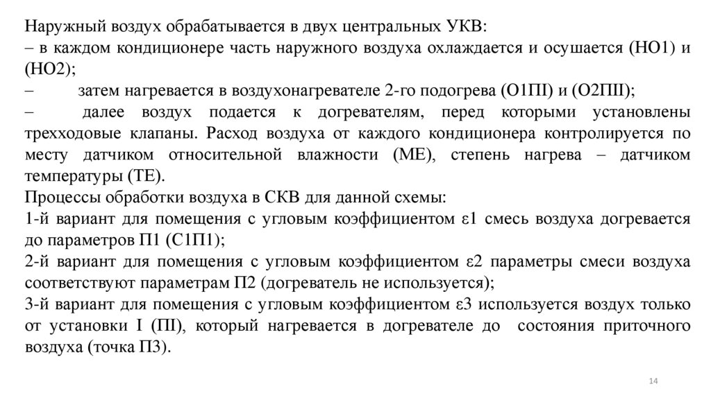 Наружный воздух обрабатывается в двух центральных УКВ:– в каждом кондиционере часть наружного воздуха охлаждается и осушается (НО1) и