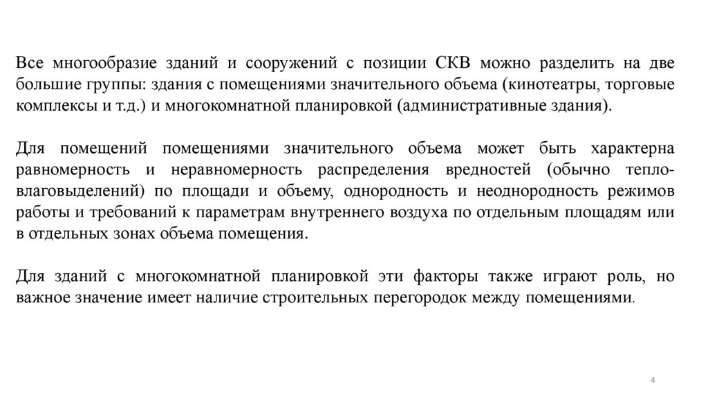 Все многообразие зданий и сооружений с позиции СКВ можно разделить на двебольшие группы: здания с помещениями значительного объема (кинотеатры, торговые