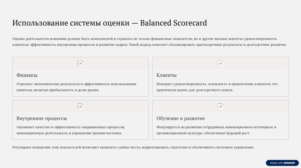Использование системы оценки — Balanced ScorecardОценка деятельности компании должна быть комплексной и отражать не только финансовые показатели, но и другие важные аспекты: удовлетворенность