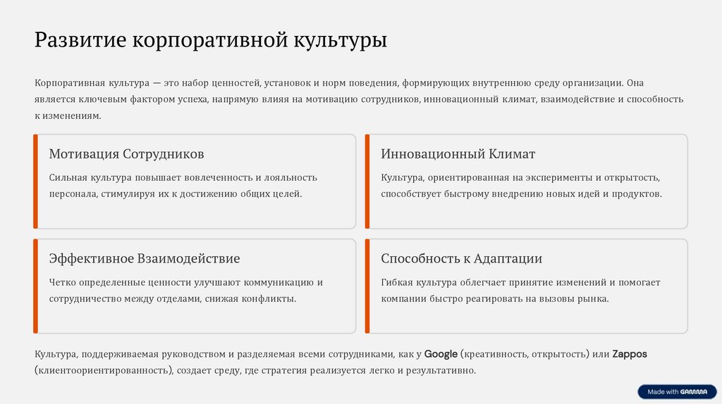 Культура, поддерживаемая руководством и разделяемая всеми сотрудниками, как у Google (креативность, открытость) или Zappos