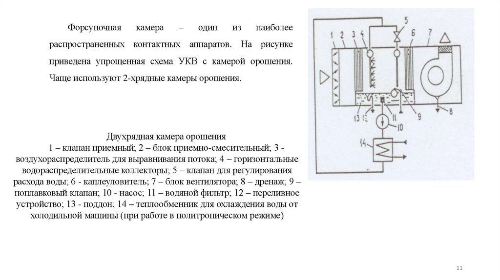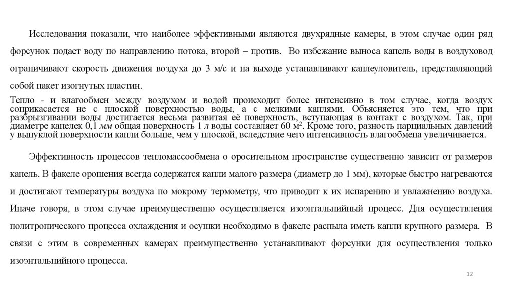 Исследования показали, что наиболее эффективными являются двухрядные камеры, в этом случае один рядфорсунок подает воду по направлению потока, второй – против. Во избежание выноса капель воды в воздуховод