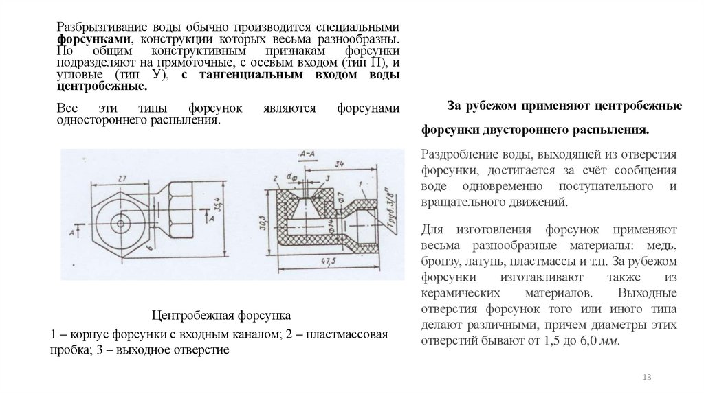 Разбрызгивание воды обычно производится специальнымифорсунками, конструкции которых весьма разнообразны.