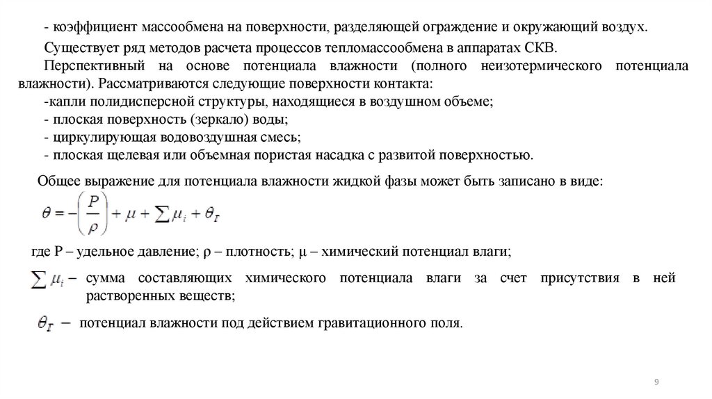 - коэффициент массообмена на поверхности, разделяющей ограждение и окружающий воздух.Существует ряд методов расчета процессов тепломассообмена в аппаратах СКВ.