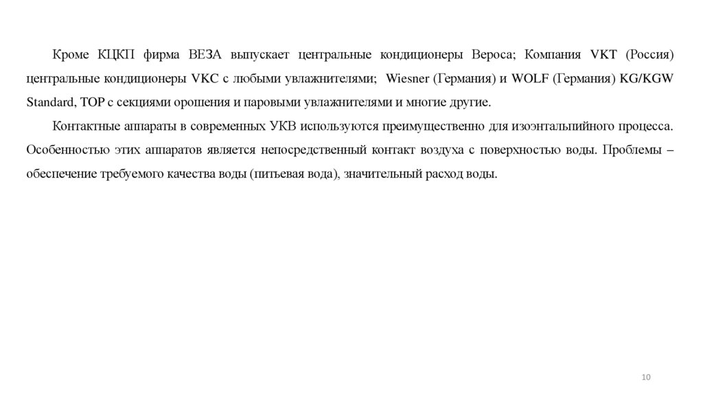 Кроме КЦКП фирма ВЕЗА выпускает центральные кондиционеры Вероса; Компания VKT (Россия)центральные кондиционеры VKC с любыми увлажнителями; Wiesner (Германия) и WOLF (Германия) KG/KGW