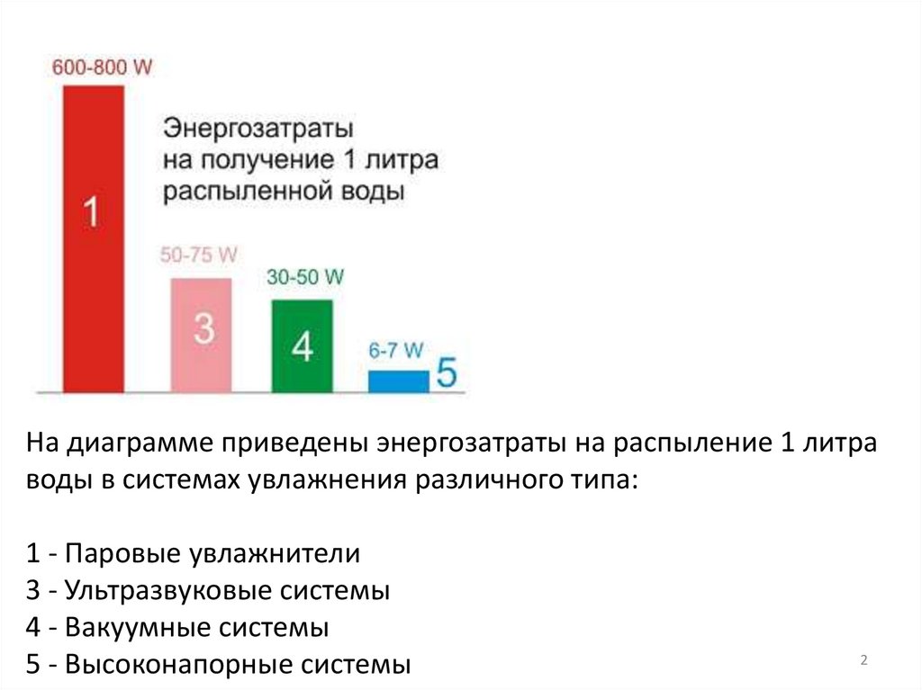 На диаграмме приведены энергозатраты на распыление 1 литраводы в системах увлажнения различного типа: