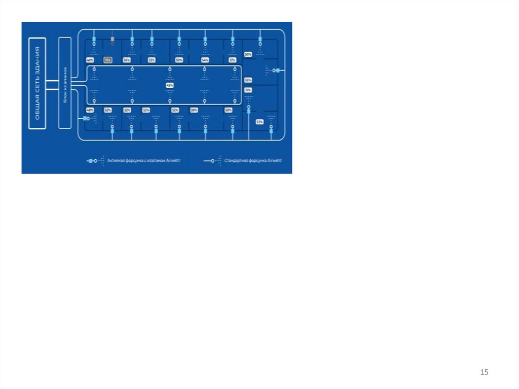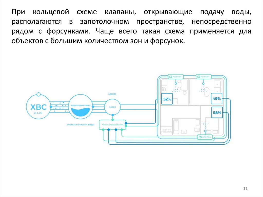 При кольцевой схеме клапаны, открывающие подачу воды,располагаются в запотолочном пространстве, непосредственно