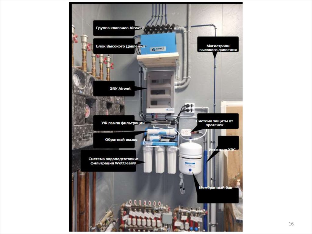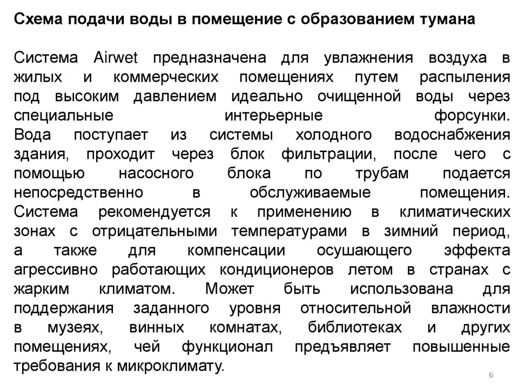 Схема подачи воды в помещение с образованием туманаСистема Airwet предназначена для увлажнения воздуха в
