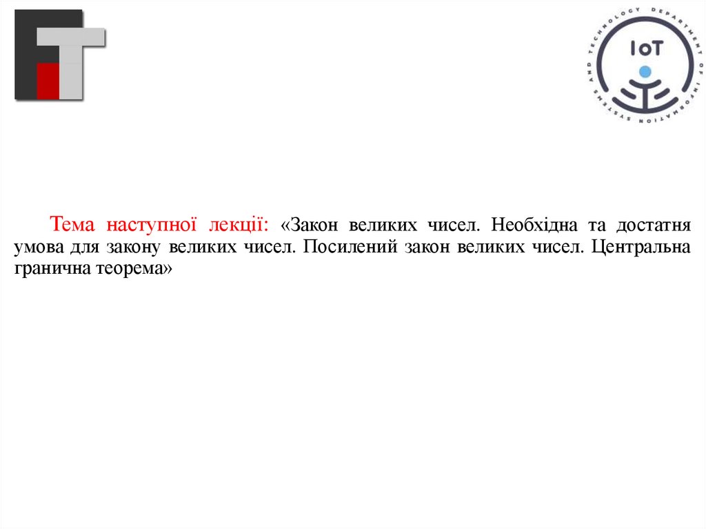 Тема наступної лекції: «Закон великих чисел. Необхідна та достатняумова для закону великих чисел. Посилений закон великих чисел. Центральна