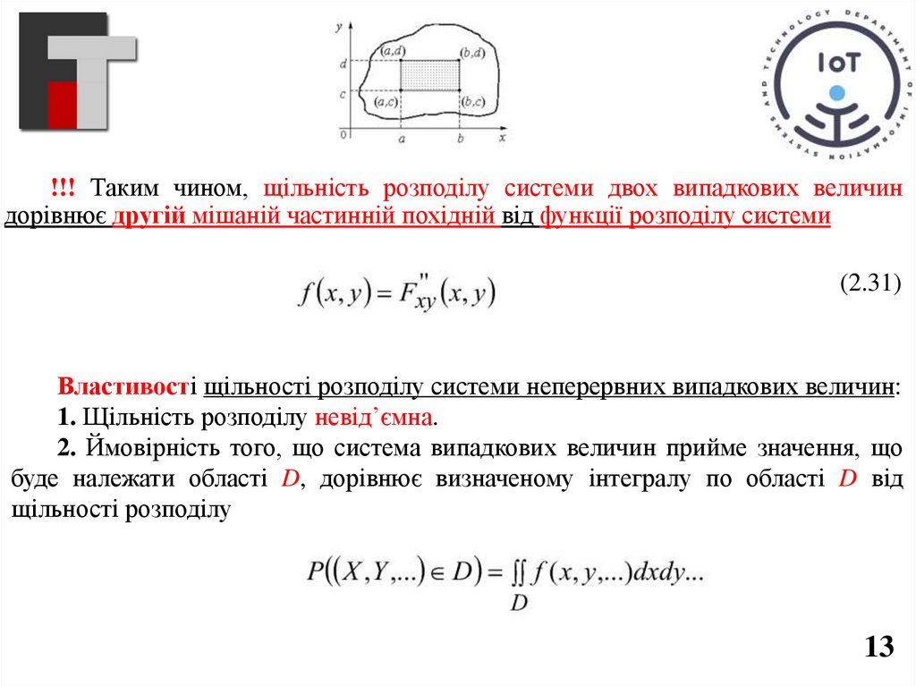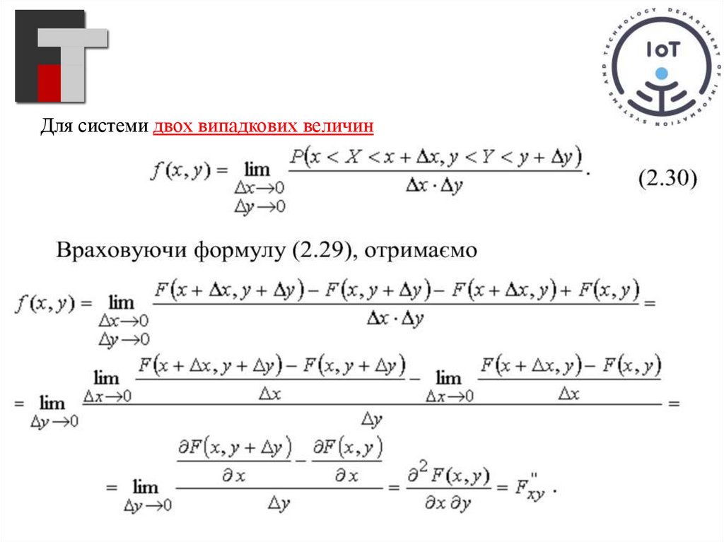 !!! Таким чином, щільність розподілу системи двох випадкових величиндорівнює другій мішаній частинній похідній від функції розподілу системи