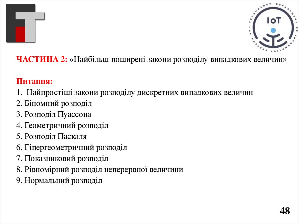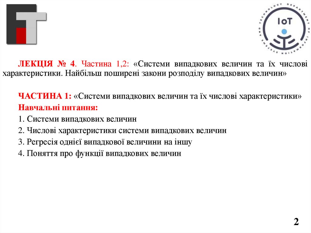 ЛЕКЦІЯ № 4. Частина 1,2: «Системи випадкових величин та їх числовіхарактеристики. Найбільш поширені закони розподілу випадкових величин»