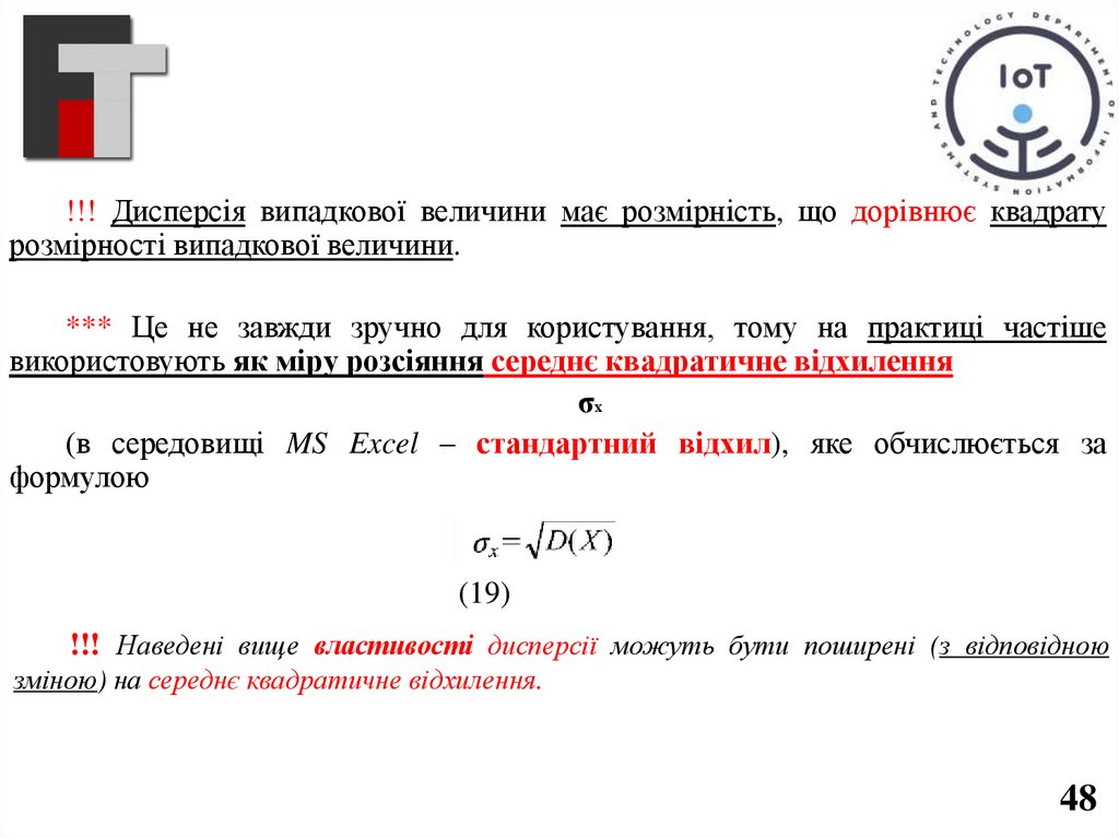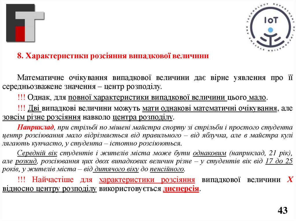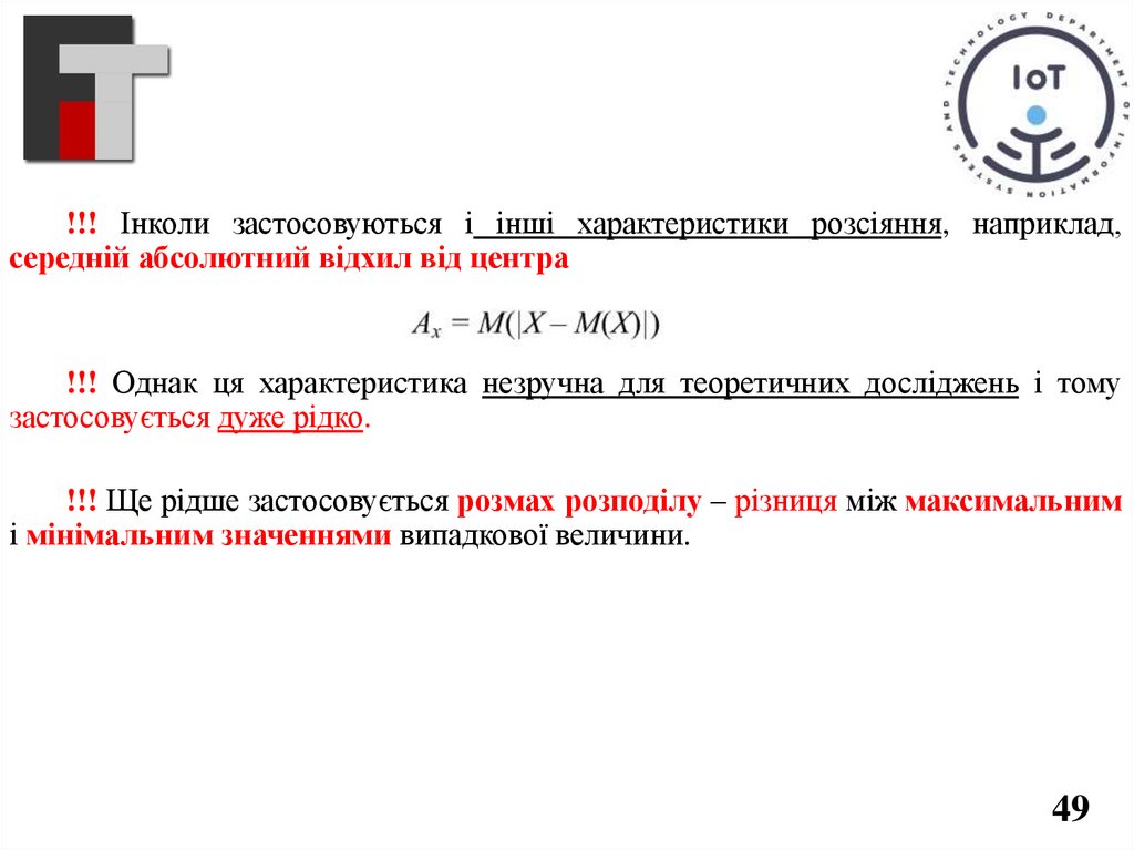 !!! Інколи застосовуються і інші характеристики розсіяння, наприклад,середній абсолютний відхил від центра