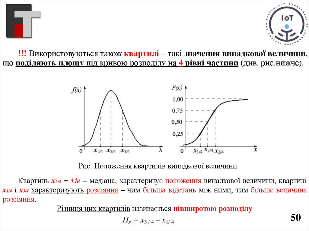 Квартиль х2/4 = Ме – медіана, характеризує положення випадкової величини, квартилі