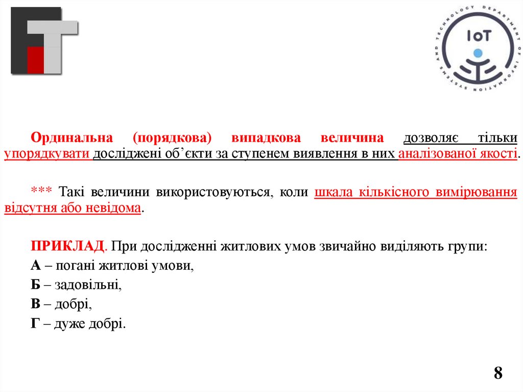 Ординальна (порядкова) випадкова величина дозволяє тількиупорядкувати досліджені об’єкти за ступенем виявлення в них аналізованої якості.