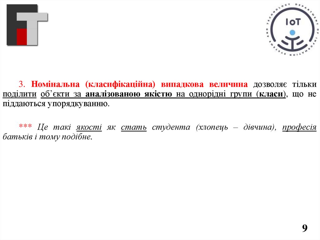 3. Номінальна (класифікаційна) випадкова величина дозволяє тількиподілити об’єкти за аналізованою якістю на однорідні групи (класи), що не
