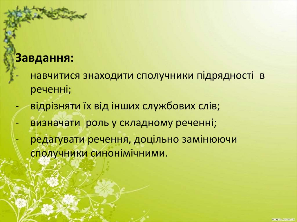 Завдання:- навчитися знаходити сполучники підрядності в