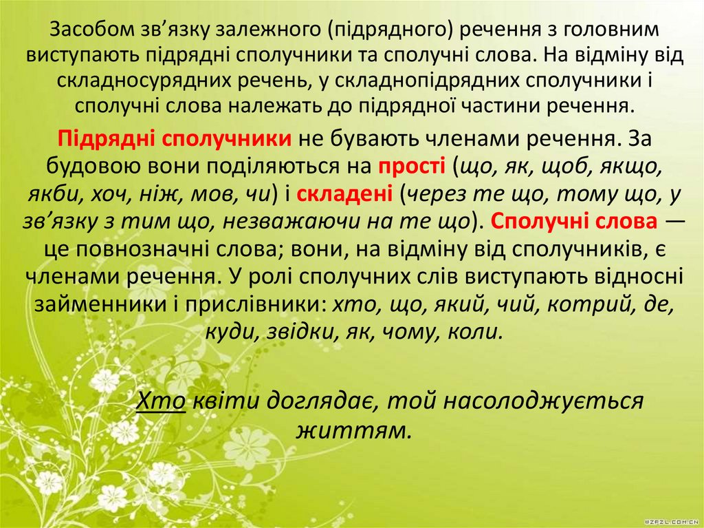 Засобом зв’язку залежного (підрядного) речення з головнимвиступають підрядні сполучники та сполучні слова. На відміну від