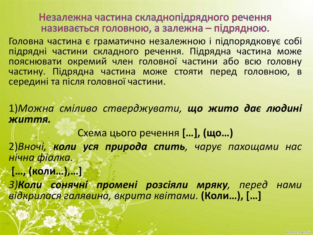 Головна частина є граматично незалежною і підпорядковує собіпідрядні частини складного речення. Підрядна частина може