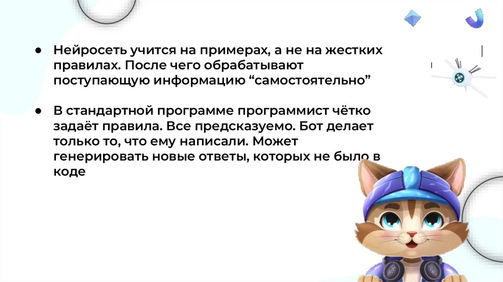 ● Нейросеть учится на примерах, а не на жесткихправилах. После чего обрабатывают