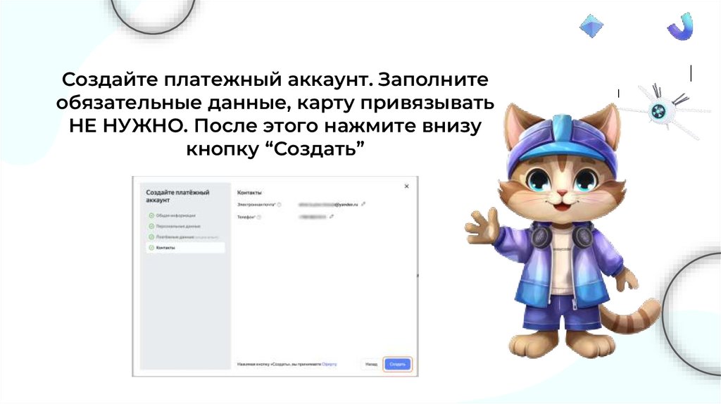 Создайте платежный аккаунт. Заполнитеобязательные данные, карту привязывать