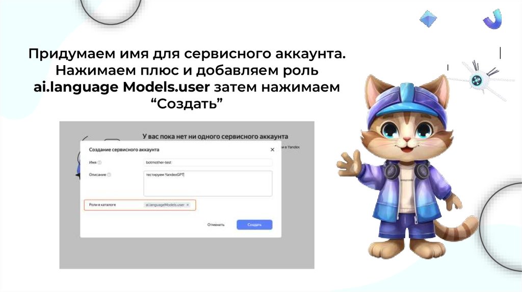 Придумаем имя для сервисного аккаунта.Нажимаем плюс и добавляем роль