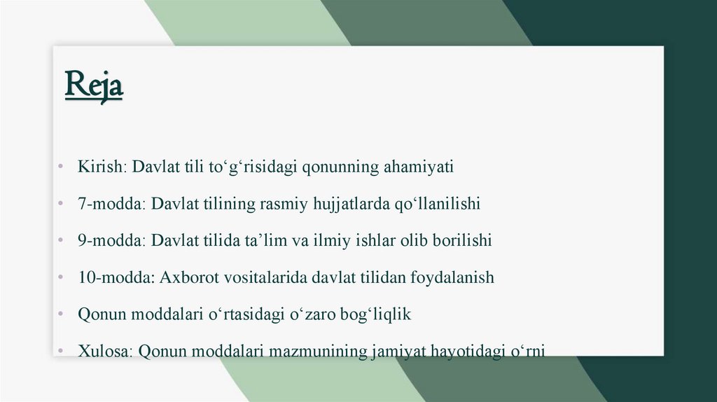 Reja• Kirish: Davlat tili to‘g‘risidagi qonunning ahamiyati