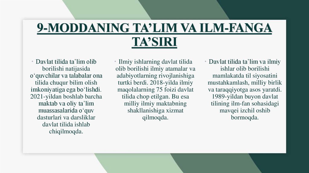 • 9-modda: Davlat tilida ta’lim va ilmiy ishlar olib borilishi