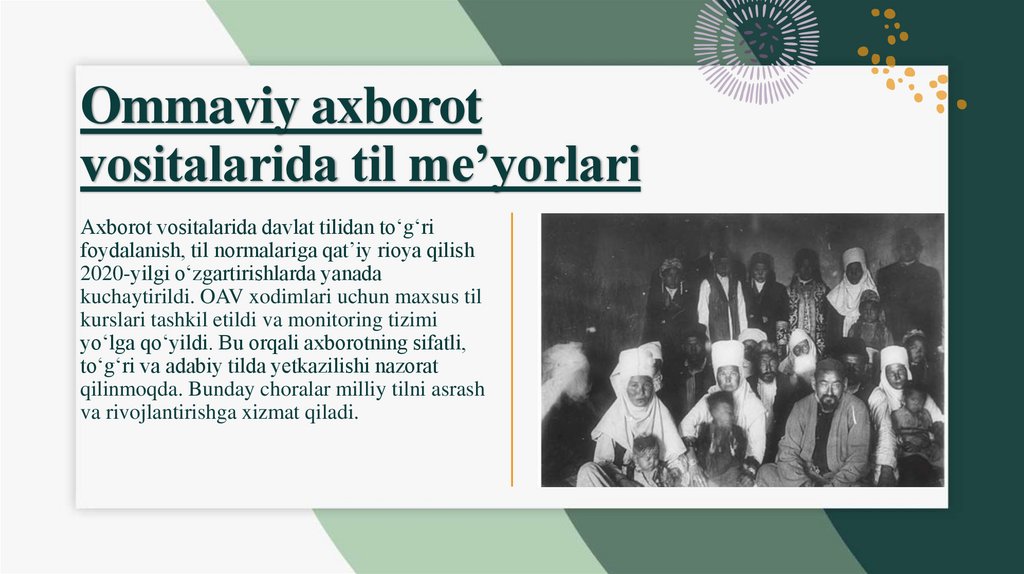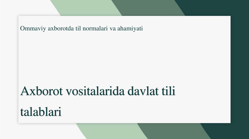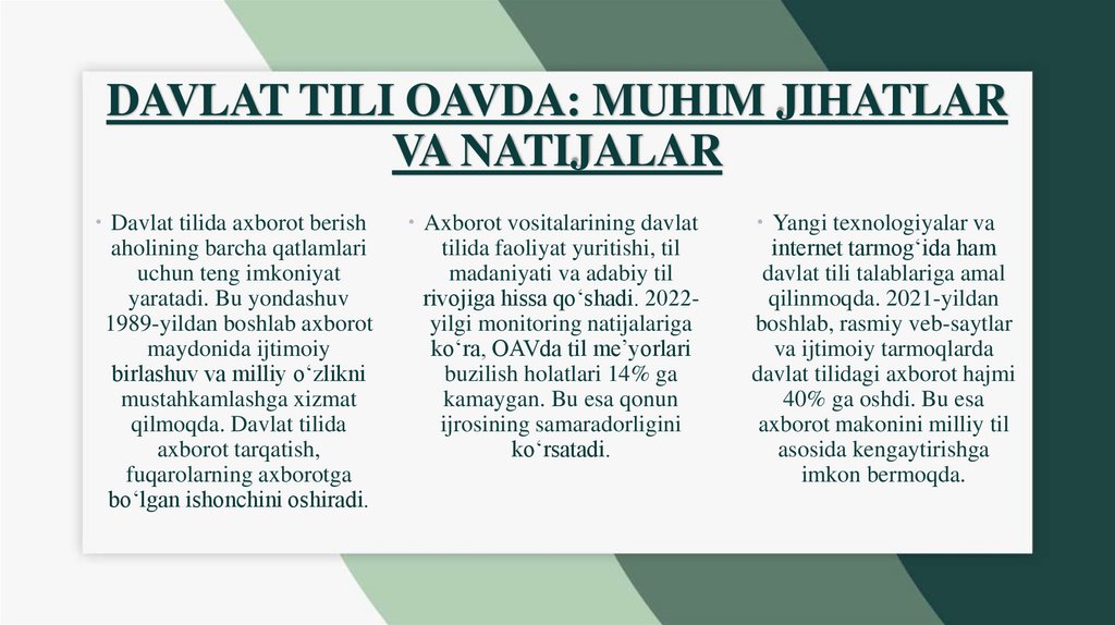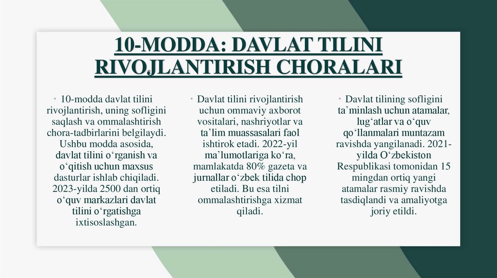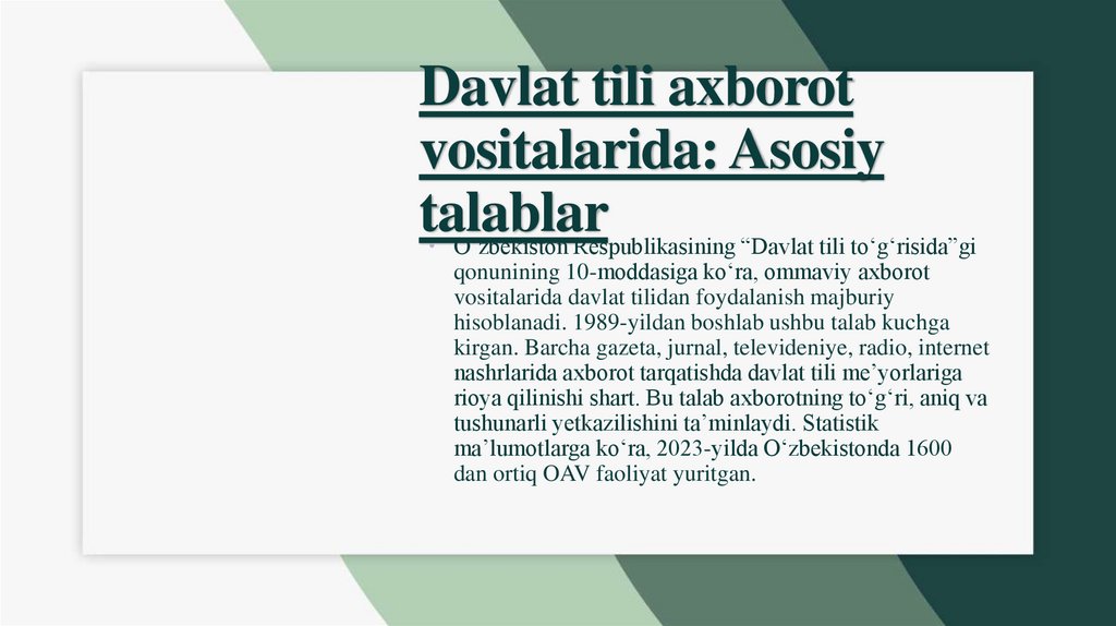 • 10-modda: Axborot vositalarida davlat tilidan foydalanish