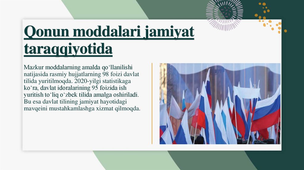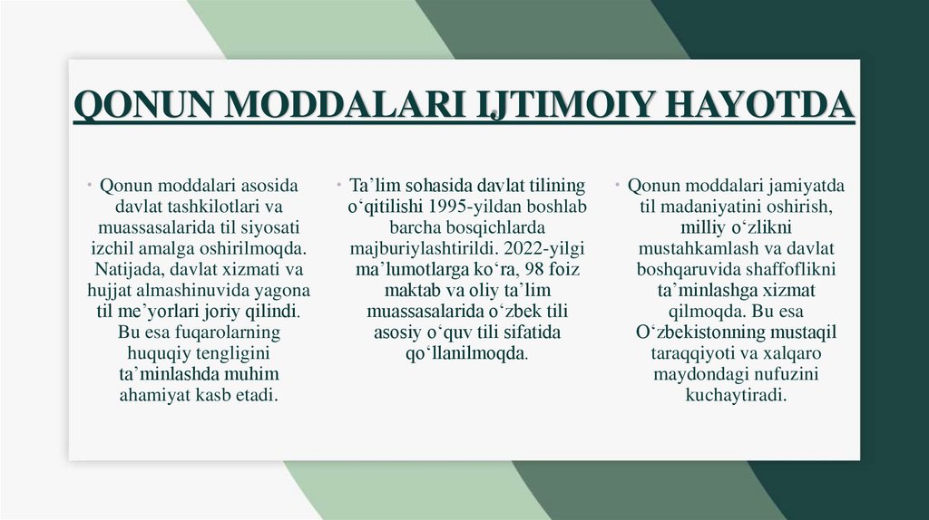 Davlat tili qonuni amaliy ahamiyatiQonun moddalari jamiyat hayotida