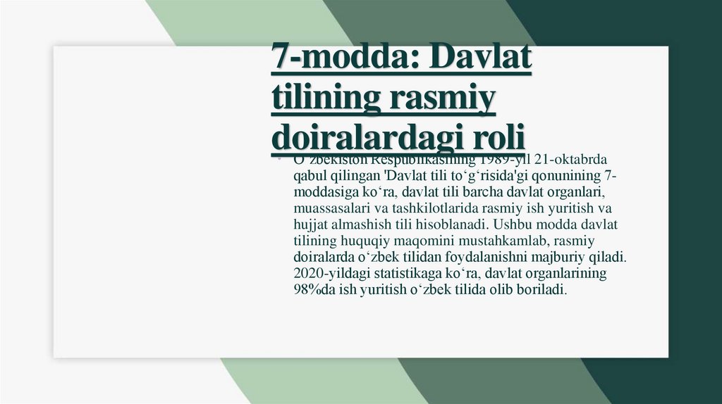 qo‘llanilishini belgilaydi. 7-moddada davlat tilining