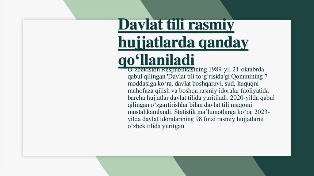 qabul qilingan 'Davlat tili to‘g‘risida'gi qonunining 7moddasiga ko‘ra, davlat tili barcha davlat organlari,