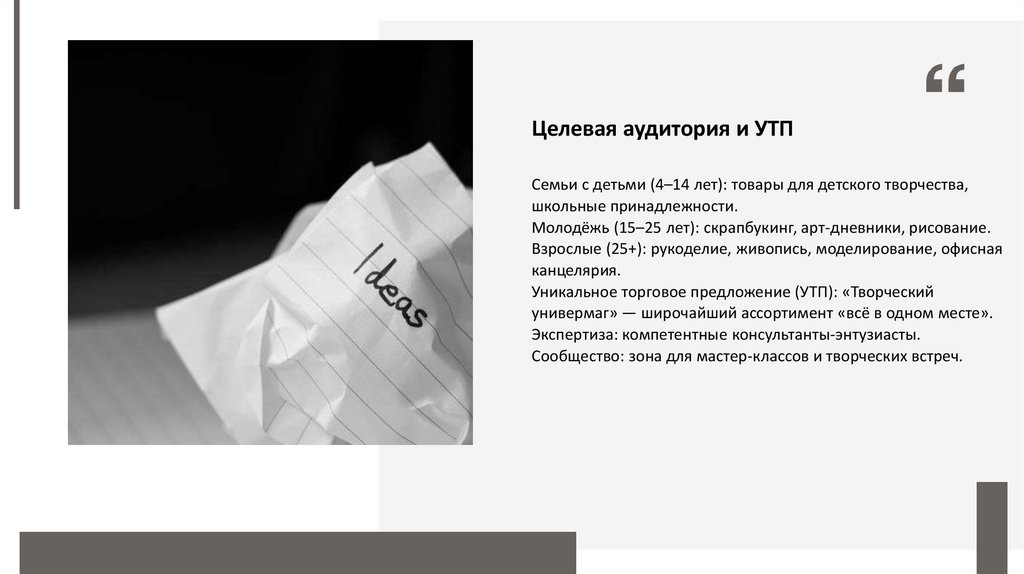 Целевая аудитория и УТПСемьи с детьми (4–14 лет): товары для детского творчества,