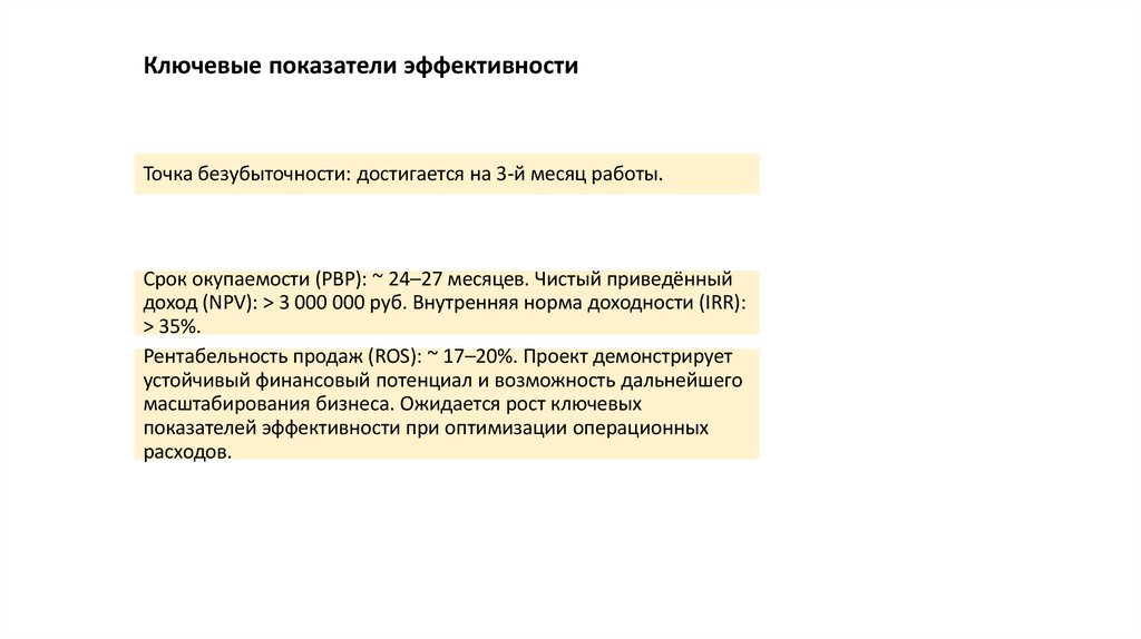 Ключевые показатели эффективностиТочка безубыточности: достигается на 3-й месяц работы.